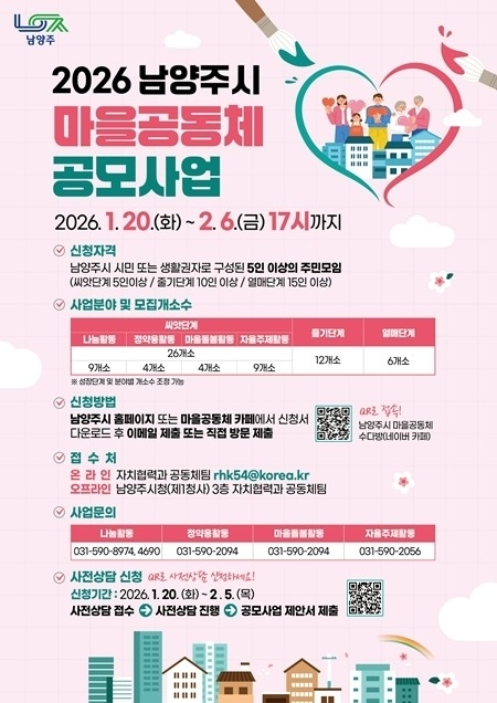 남양주시는 1월 20일부터 2월 6일까지 ‘2026년 마을공동체 공모사업’참여 공동체를 공개 모집한다.