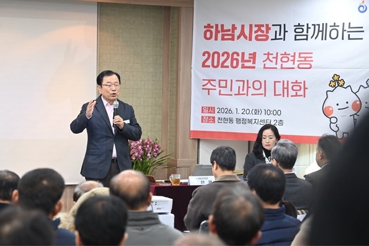 사진2 설명 : 20일 오전 천현동 행정복지센터에서 열린 ‘2026년 천현동 주민과의 대화에서 이현재 하남시장이 주민들의 주요 관심사인 캠프 콜번 개발사업의 조속한 추진과 산곡초등학교의 안정적인 운영 지원을 약속하고 있다.