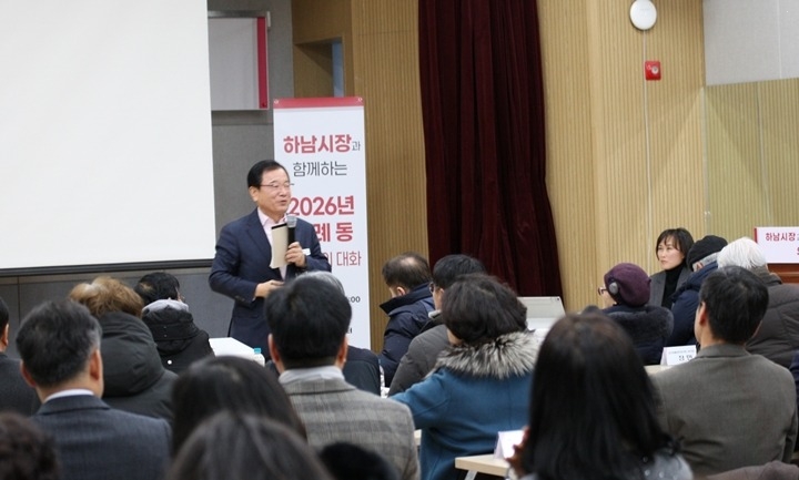 사진1,2 설명 : 21일 오후 위례동 행정복지센터에서 열린 ‘2026년 위례동 주민과의 대화에서 이현재 하남시장이 위례동 주민들의 질의에 답변하고 있다.