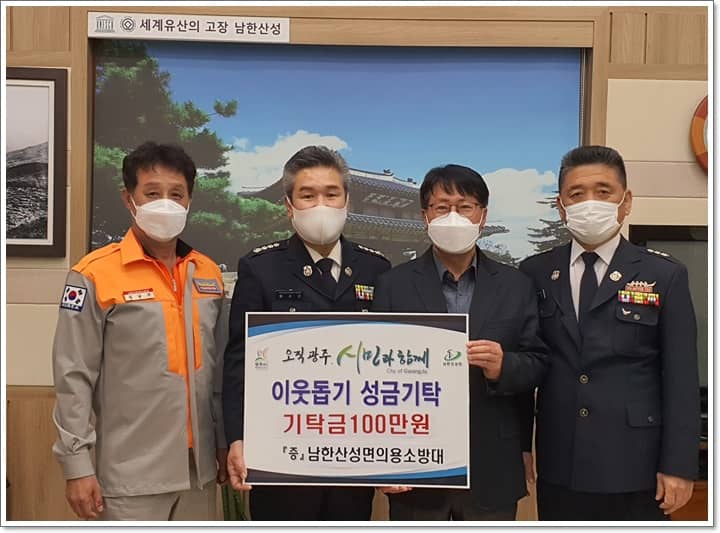광주시 남한산성면 의용소방대(대장 황수근) 회원들은 4일 남한산성면 행정복지센터를 방문, 이웃돕기 성금 100만원을 기탁했다.
