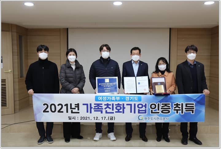 광주도시관리공사(사장 박남수)는 지난 12월 17일 여성가족부 및 경기도에서 주관한 “ 가족친화 우수기업 인증 ”을 동시에 취득하였다.