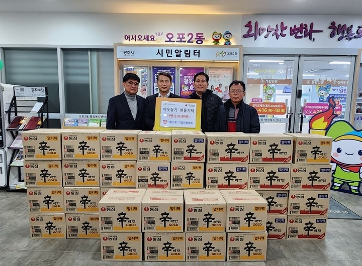 [굿타임즈24/광주시] 하홍모 기자 = 광주시 매산1통 기업인협의회는 20일 오포2동 행정복지센터를 방문해 100만 원 상당의 라면을 기탁하며 지역사회 나눔을 실천했다.